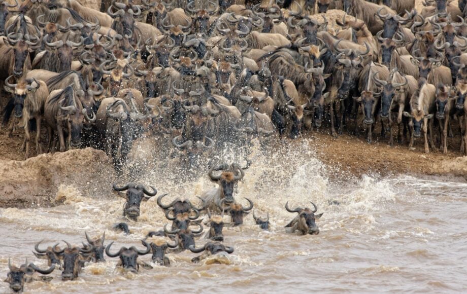 L’attraversamento del fiume Mara è l’ostacolo principale durante la migrazione. A regnare infatti sono panico e confusione: le mandrie, composte da centinaia di migliaia di animali, cercano di attraversare il fiume impetuoso e di sopravvivere ai coccodrilli affamati.