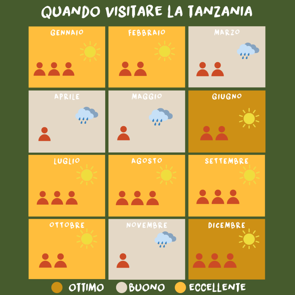 Per informazioni più dettagliate sulle condizioni climatiche, visita la nostra pagina dedicata al clima della Tanzania.